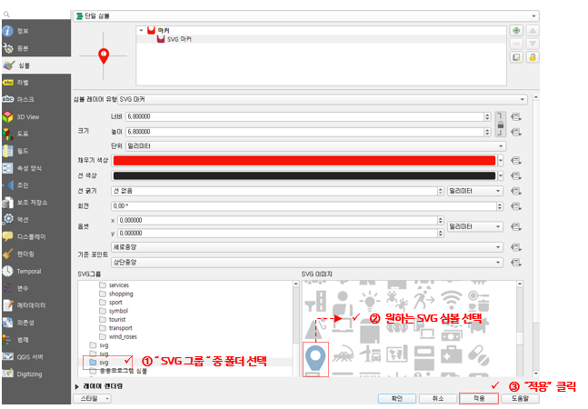 그럼 "SVG 이미지"에서 원하는 심볼을 선택 후 아래 "적용" 버튼을 클릭합니다.