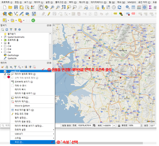 2. 심볼을 변경할 레이어를 선택 후, 오른쪽 클릭하여 "속성"을 선택합니다.