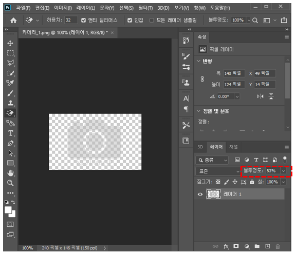 3) 오른쪽 불투명도를 줄여주면 전체적으로 이미지의 투명도가 바뀌는 것을 알 수 있습니다.