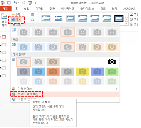 2) 아래 "색"부분 클릭 후 "투명한 색 설정"을 클릭합니다.